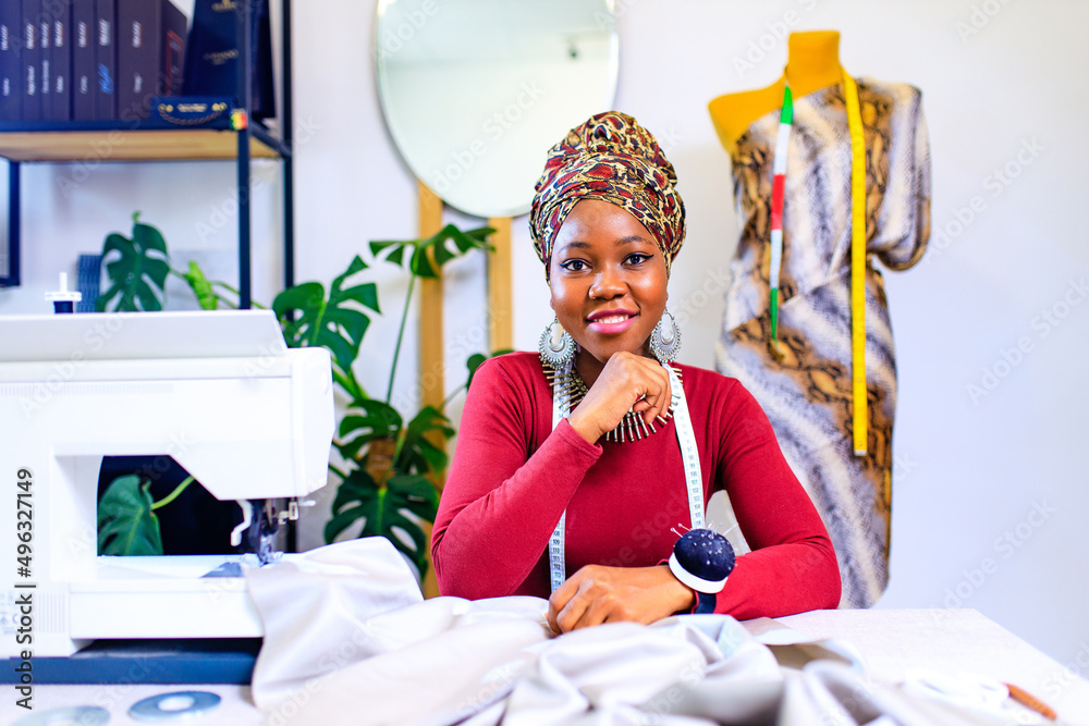 tanzanian woman with snake print turban over hear working in dressmaking shop