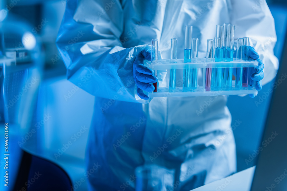partial view of bioengineer in hazmat suit holding test tubes in lab.