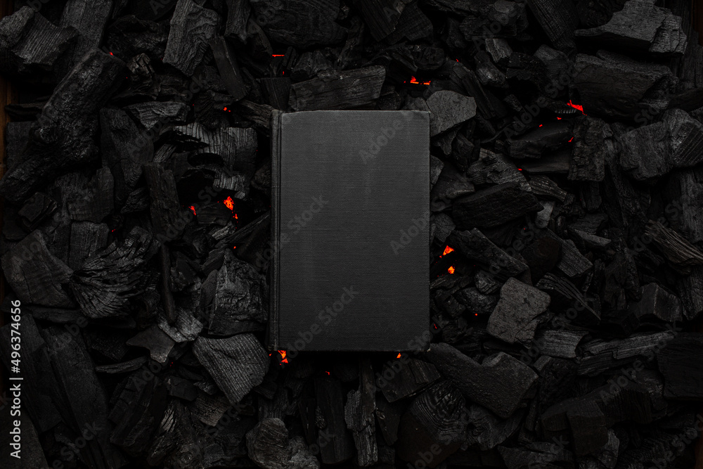 A closed book with a black cover on smoldering charcoal. Textured dark back.