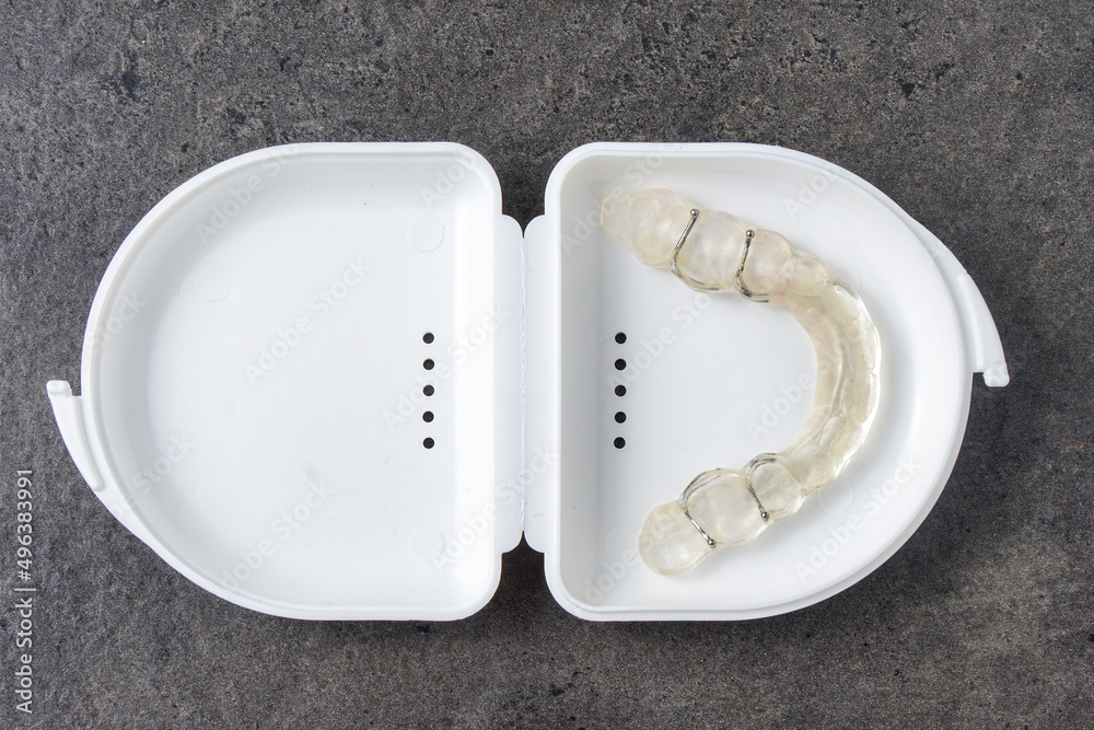 Dental splint, a device made for occlusion problems, bruxism or as retainer after braces.