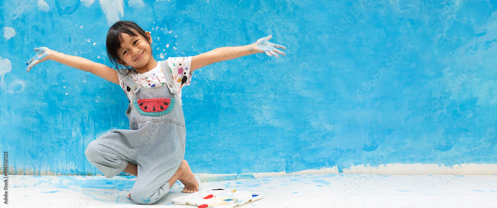 Banner of asian little girl is painting the blue color on the wall and she look happy and funny, concept of art , steam education and learn through play activity for kid development.