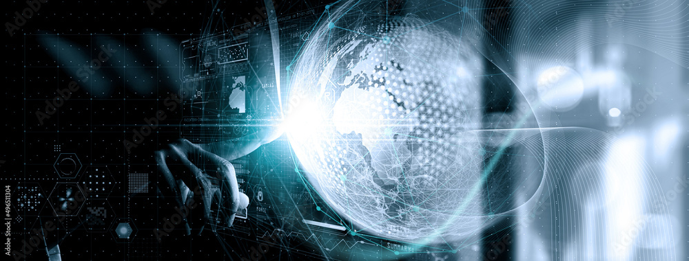 Businesswoman hand touchs global network,futuristic technology background,Global business,IoT Internet of Things, internet network connection,business intelligence concept