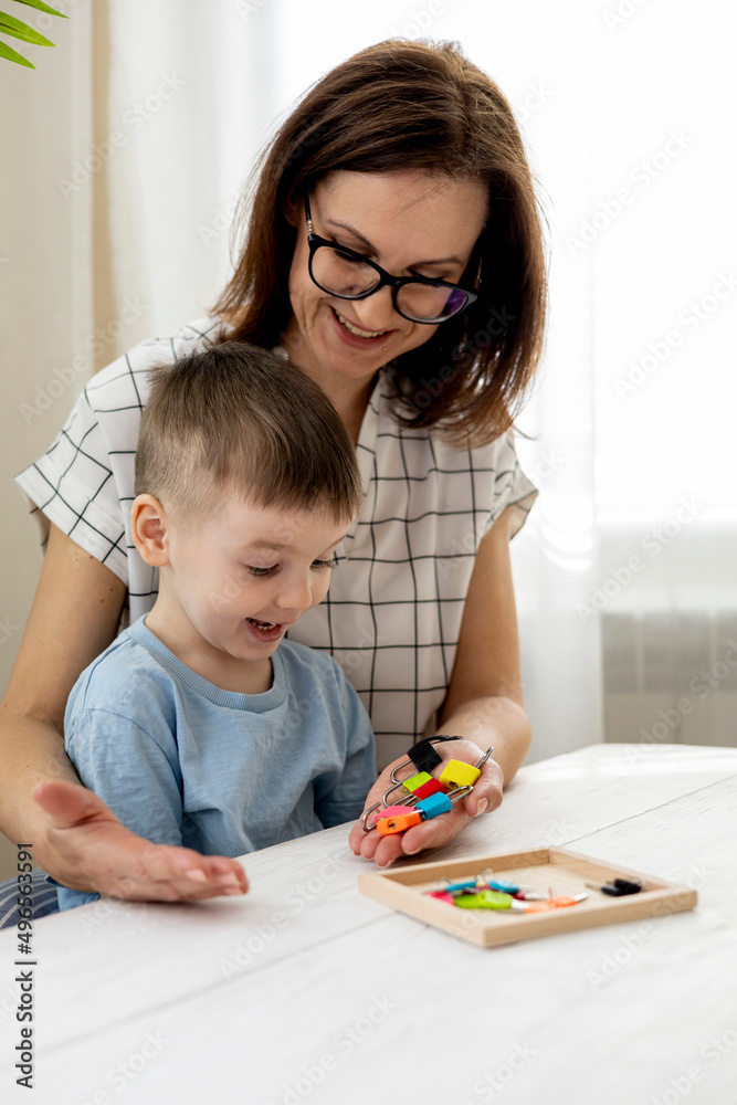 Montessori material. Woman and a boy are studying a puzzle with keys and locks.