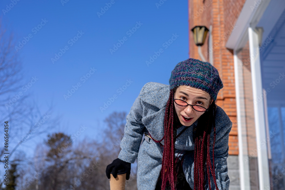 Young Asian girl eco-friendly . Reusable glass for hot drink. Walk on the street.