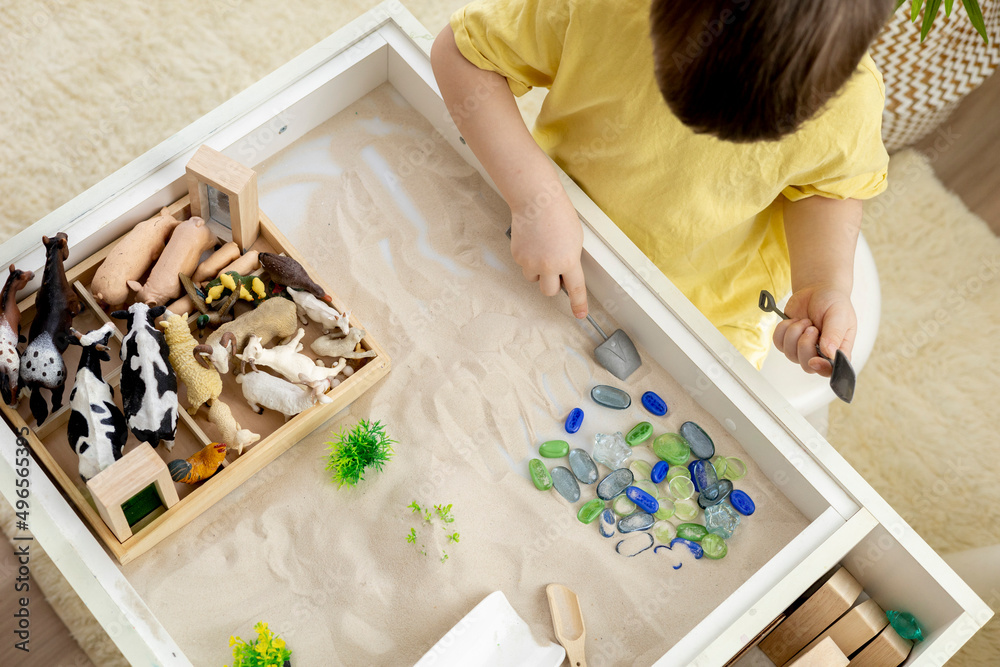 Montessori material. Little boy explores the farm animals in the game. Flat lay