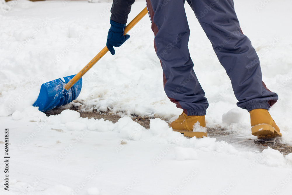 Close-up as man shovels snow