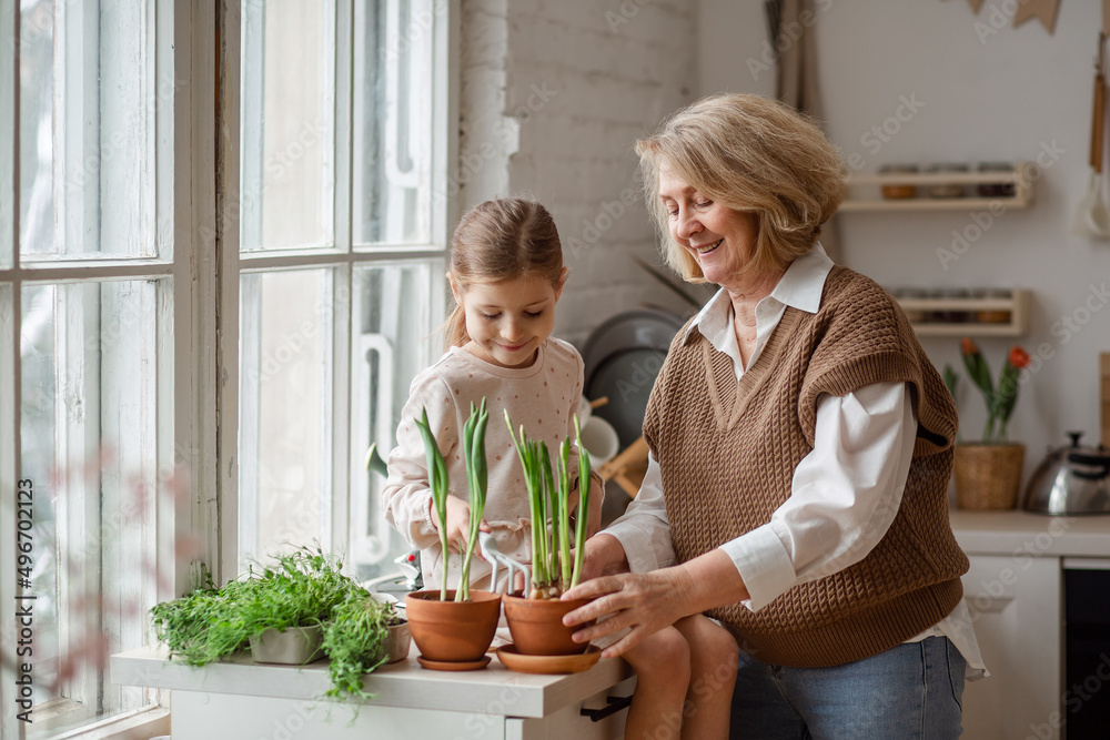 An elderly woman grandmother and a little girl granddaughter take care of and plant potted plants inside the house, do gardening in the spring for Earth Day