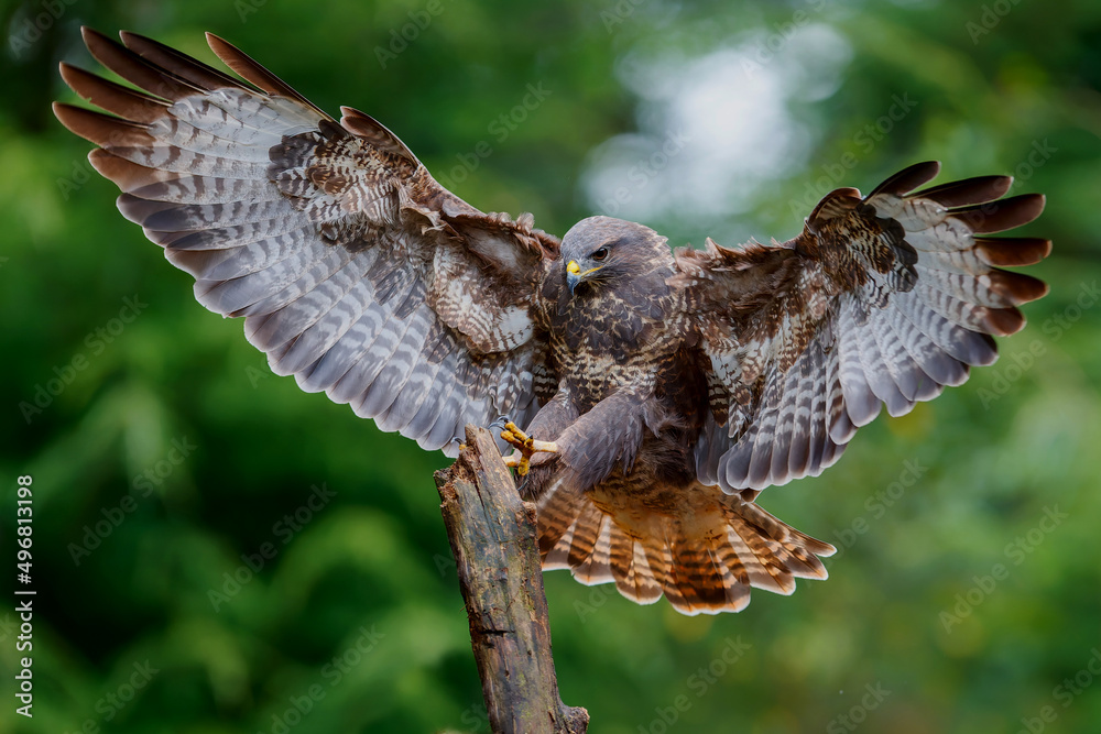 Common Buzzard (Buteo buteo) flying in the forest of Noord Brabant in the Netherlands searching for food. Green forest background.