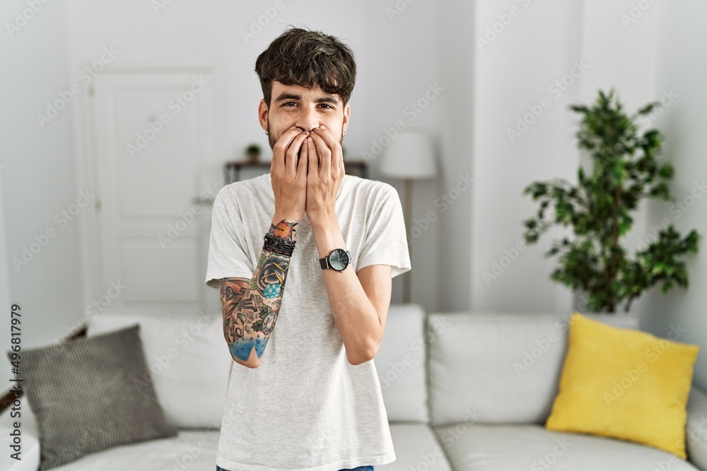 Hispanic man with beard at the living room at home laughing and embarrassed giggle covering mouth with hands, gossip and scandal concept