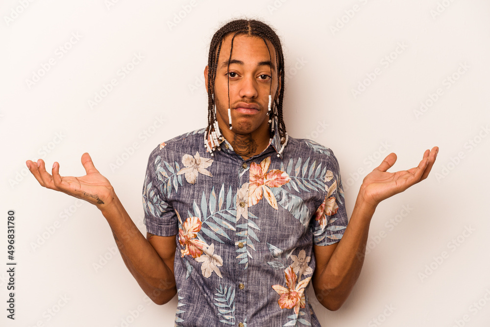 Young African American man isolated on white background doubting and shrugging shoulders in questioning gesture.
