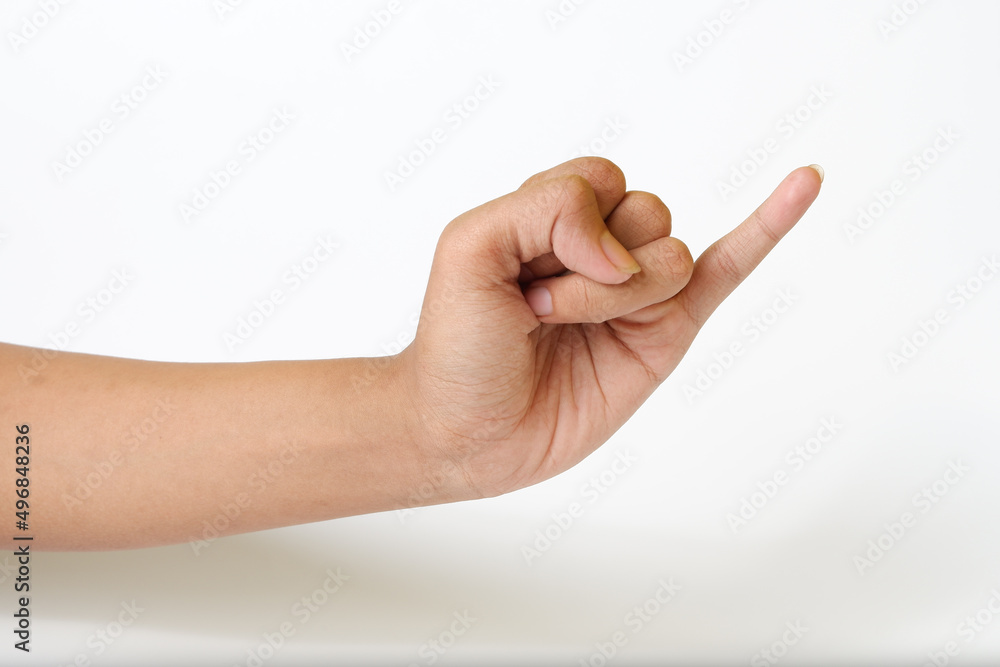 Adult female hand showing pinky little finger or gesture of making a promise on a white background