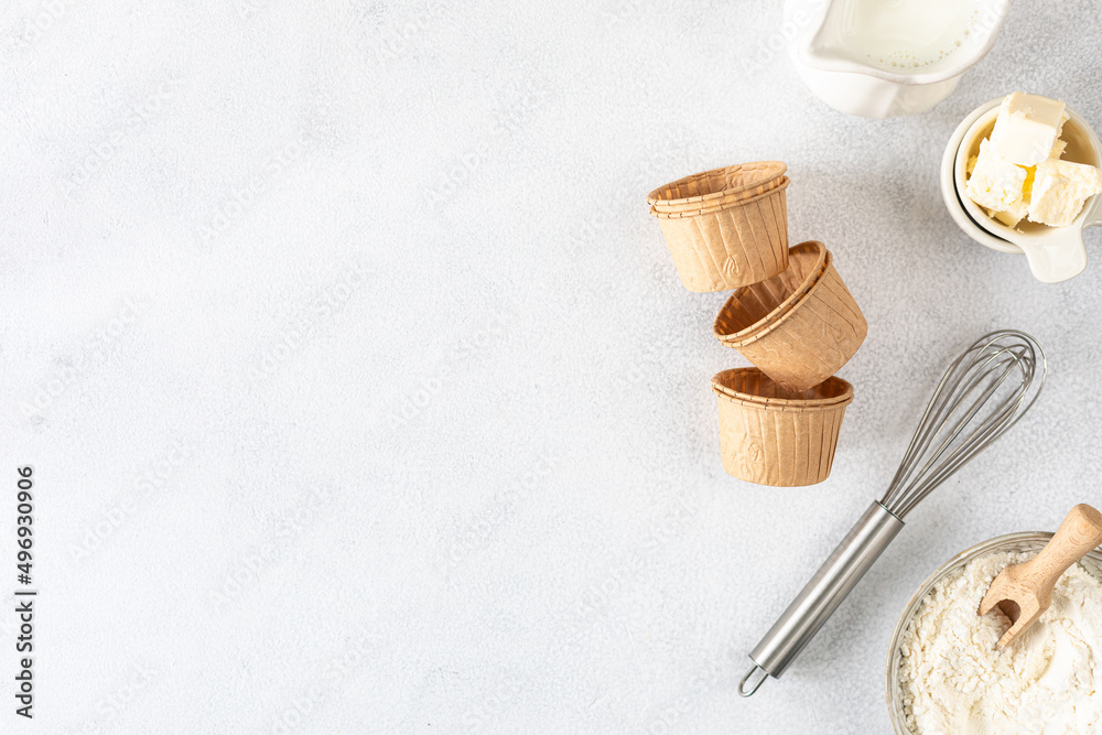 Paper cupcake baking pans on a white concrete background and ingredients: Flour, butter, sugar, whisk, milk. Copy space. Baking concept.