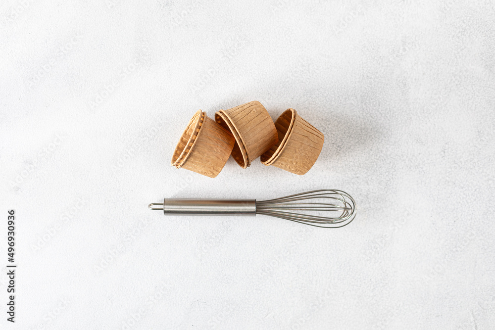 The concept of homemade baking is a whisk for whipping and cupcake molds on a white background. Zero waste. Copy space. Top view.