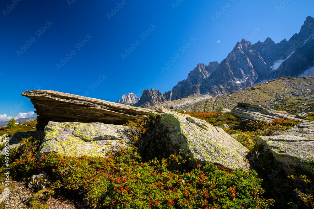 Summer scenery in the French Alps with Larix trees and sharp peaks