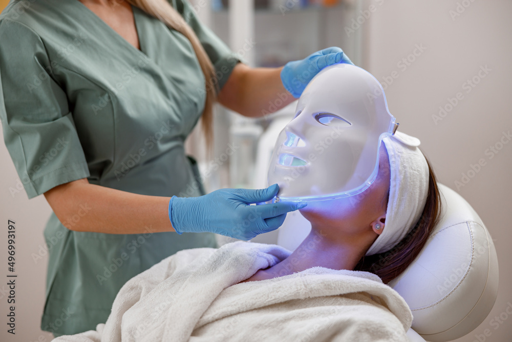 Cosmetic procedure with LED facial mask for female face. Photon therapy.