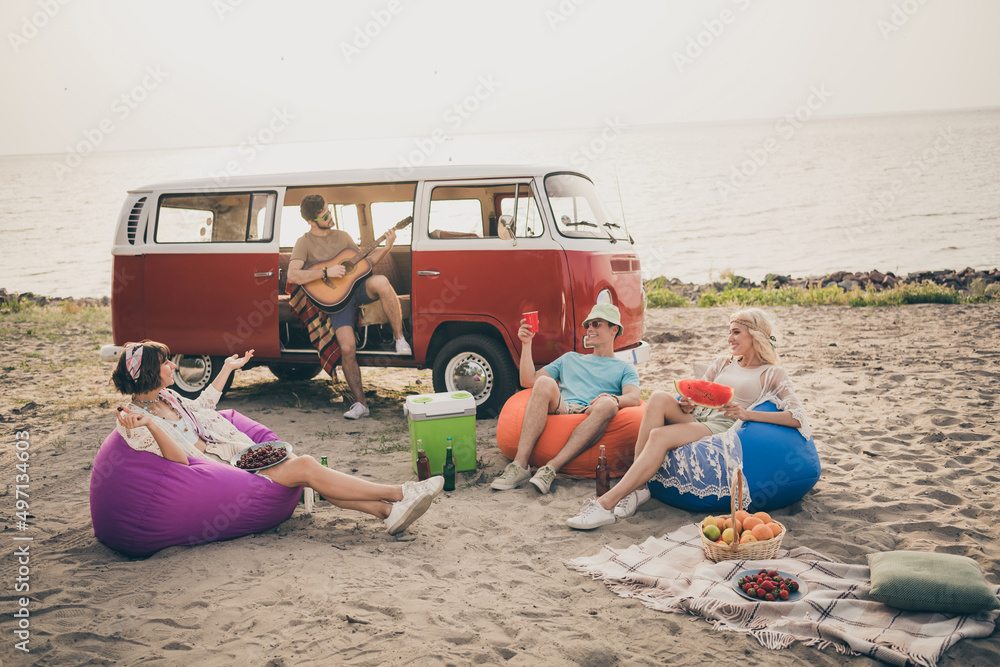 Photo of funny subculture fellows enjoy chill journey abroad wear boho outfit nature seaside beach outside