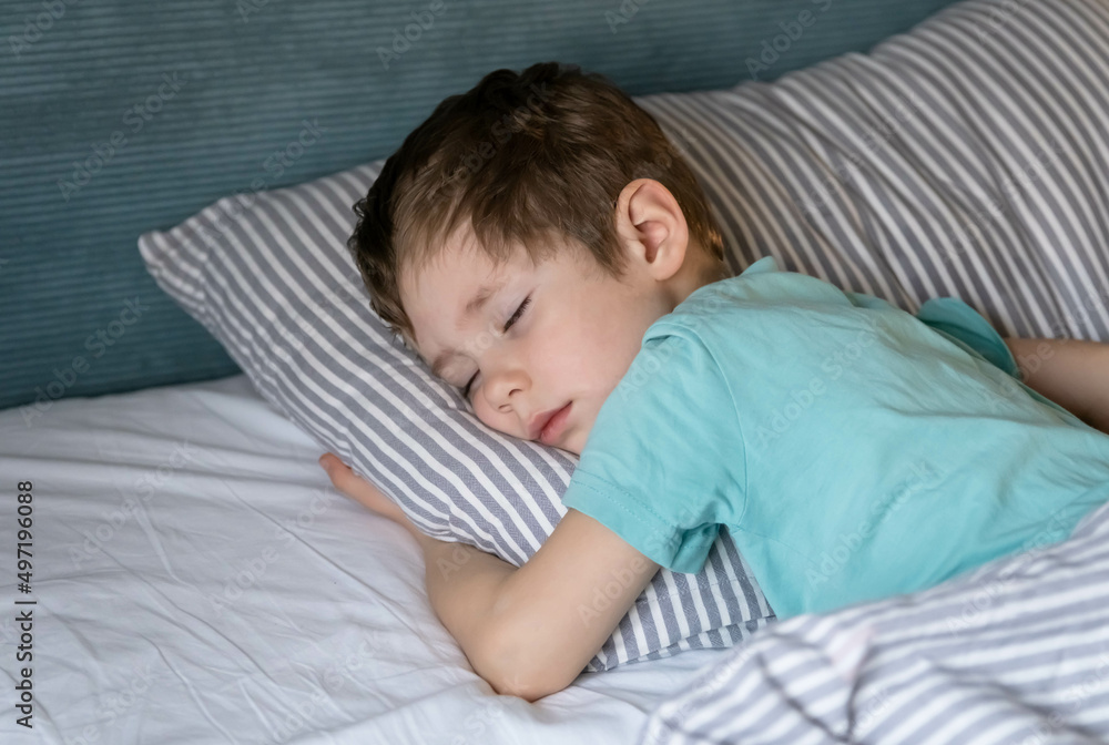 Sweet toddler child dreaming at home. Little boy sleeping. Adorable little child boy sleeping in the bed. Sleeping child in bed. Little baby napping in the nursery. Closeup boy sleeping peacefully.
