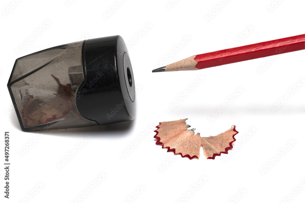 Closeup red pencil sharpener scraped white background