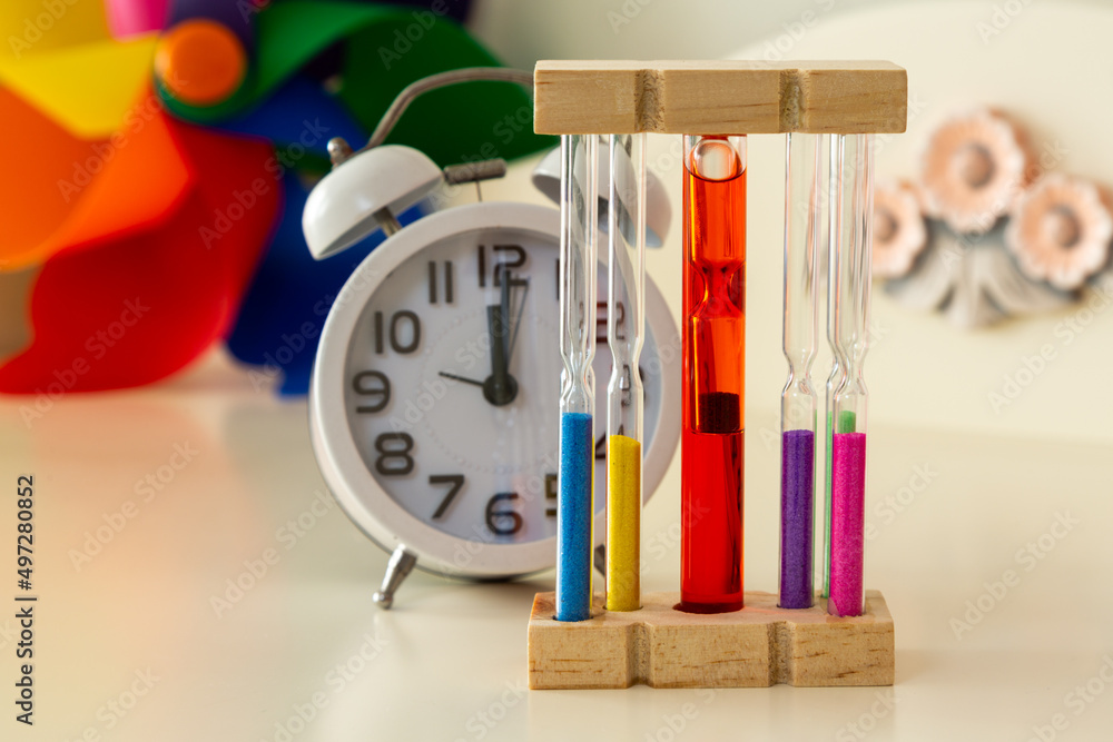 Decorative hourglass in selective focus. Out of focus classic alarm clock hidden behind hourglass. The clock shows 12 noon. Out of focus there is also the colored pinwheel.