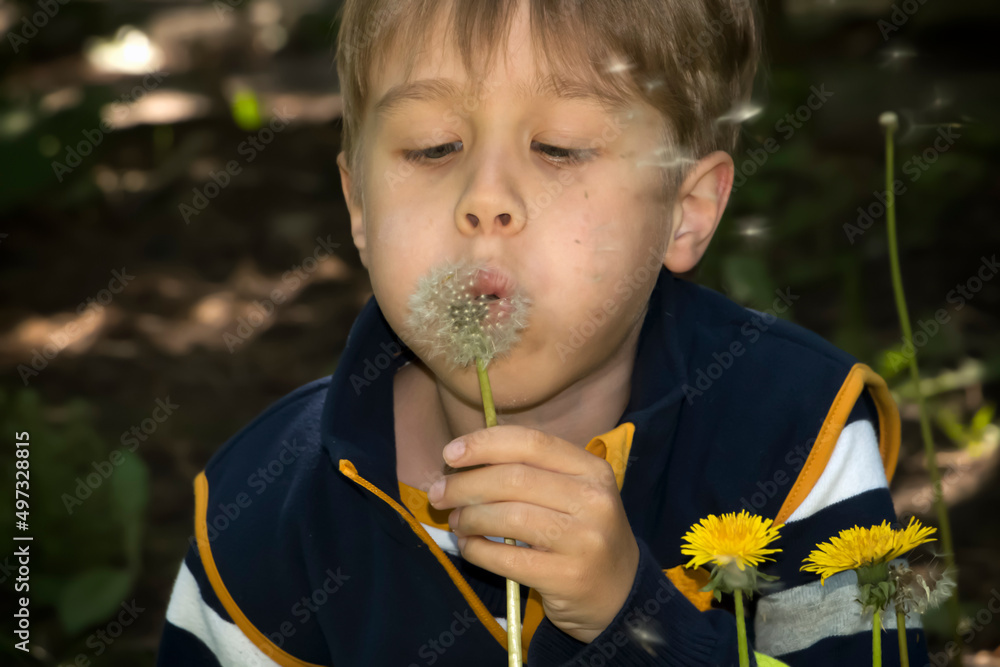 Boy blowing on a dandelion