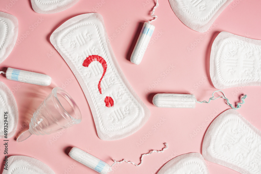 Close up pad, menstrual cup, tampon on a pink background. The view is flat. Concept of critical days, menstruation