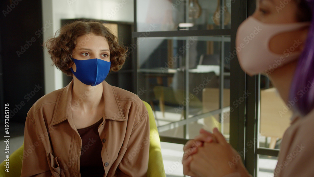 A young girl-student with short purple hair is sharing her impressions with her friends, sitting in the rest zone in the breaking tine, close up