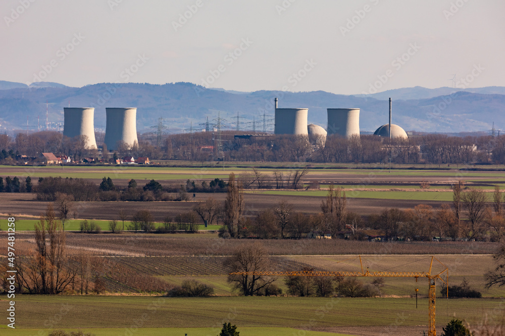 Silhouette of a nuclear power plant with houses and vineyards in the foreground
