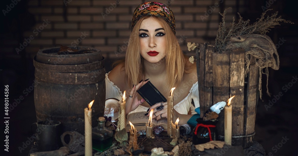 Gypsy woman with a Tarot cards, other witch stuff, concept of occultism and fate prediction