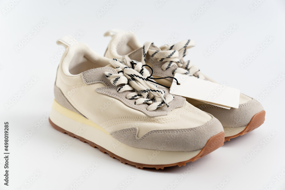 modern sneakers made of combined materials and colors with a high sole and a label with copy space. fashion shoe boutique. online store.