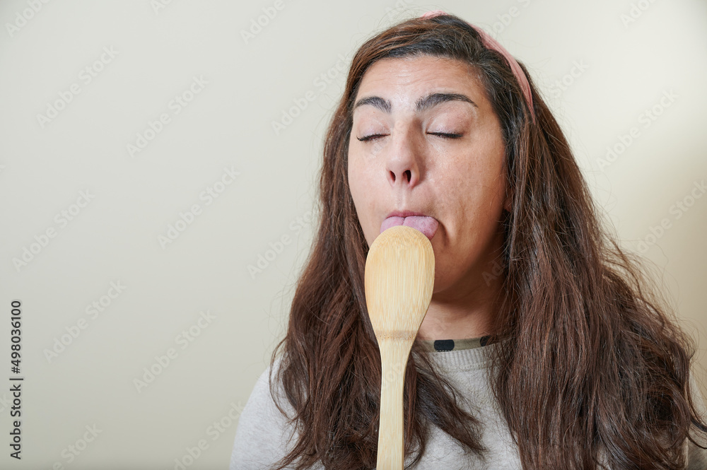 Young adult woman gesticulates as she tastes a new recipe using wooden cookware spoon. She is licking the spoon closing eyes.