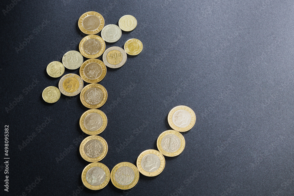 Selective focus of top view Turkish lira symbol on black isolated background. The Turkish Lira symbol is designed with coins. Investment, finance, savings, Turkish lira concept.