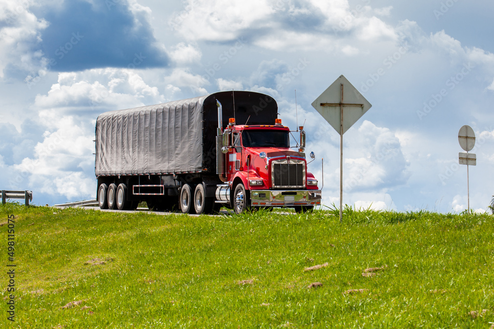 Red cargo truck on the roads of the region of valle del cauca in Colombia