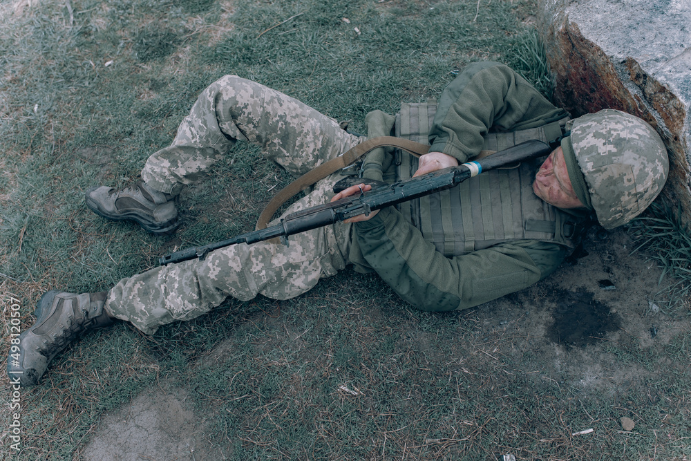 Ukrainian wounded soldier lying down on grass near rock after battle against russian enemy.