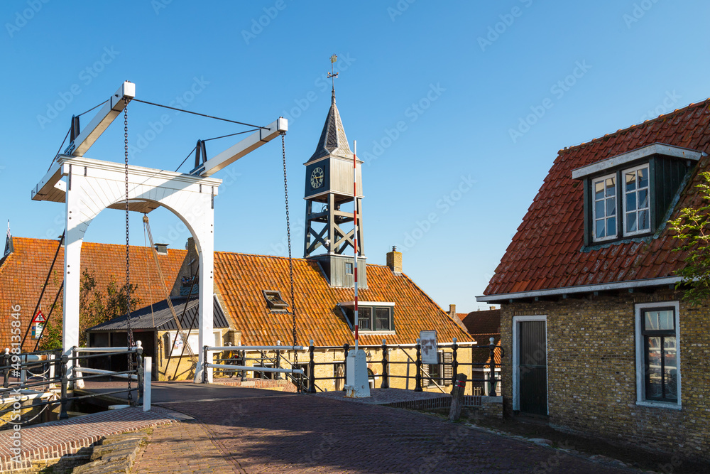 Drawbridge and clock tower at the lock in the picturesque town of Hindeloopen in Friesland.