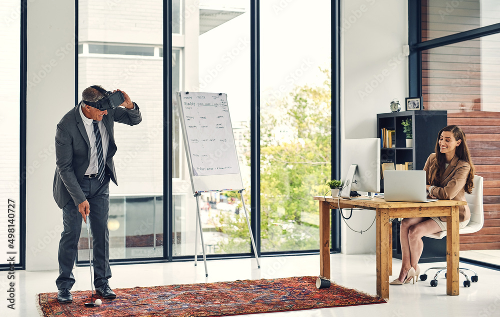 This is going to be a hole-in-one shot. Shot of a businesswoman watching her colleague play golf while wearing a VR headset in an office.