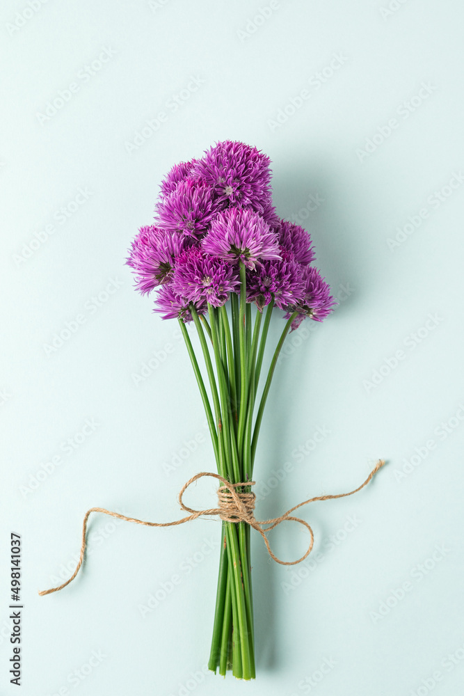 Purple allium flowers bouquet on blue background. flat lay. top view. vertical orientation