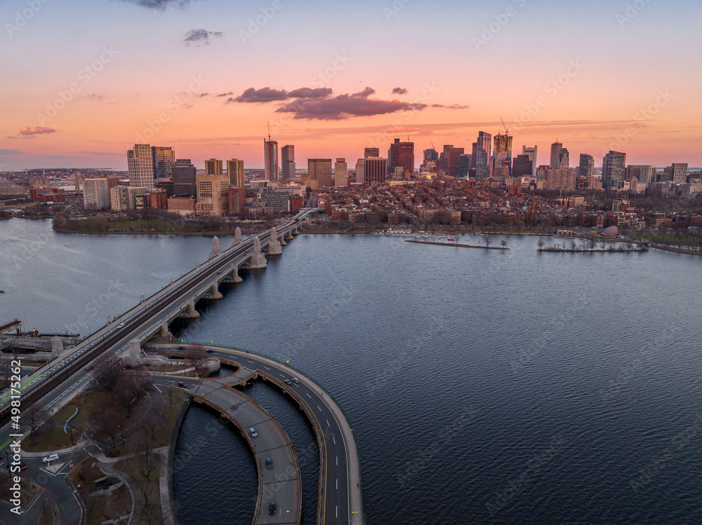 Sunset over Boston downtown with sky scrapers with views of the Longfellow bridge over the Charles river