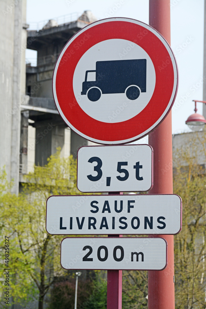 Panneau de signalisation : interdit aux poids lourds de plus de 3,5 tonnes, sauf livraisons, à 200 mètres.