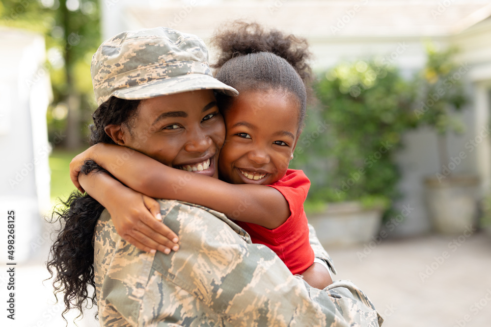 Portrait of happy female mid adult african american soldier embracing daughter outside house