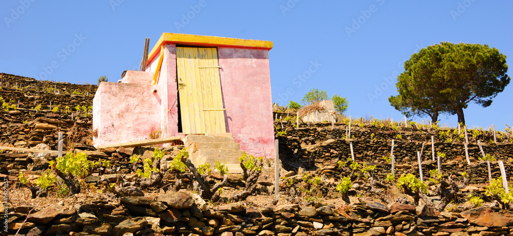 Shelter for working tools in vineyard in Languedoc Roussillon. South of France.