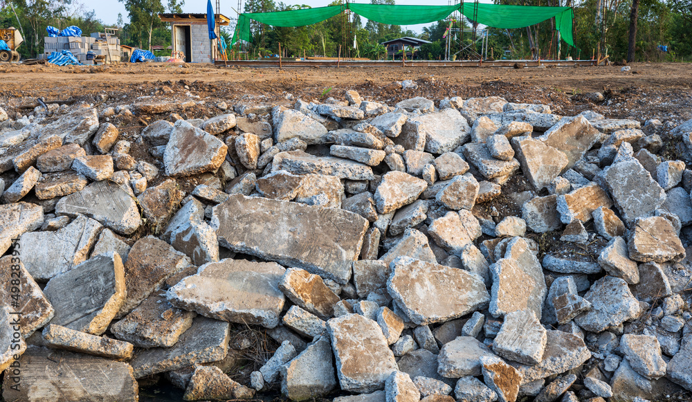 View of the rubble of many large concrete blocks was obtained from the demolition of roads.