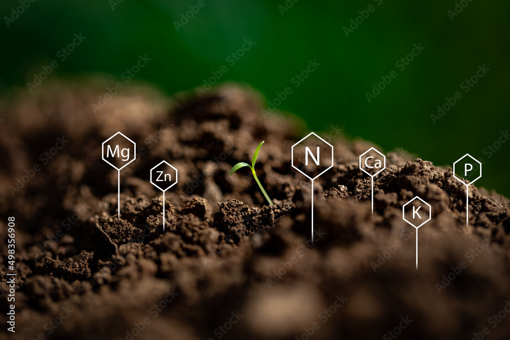 Chemical symbols of nitrogen, potassium, phosphorus, calcium, magnesium and zinc portrayed as a association of soil testing elements next to just emerged young plant on fertile, wet ground.
