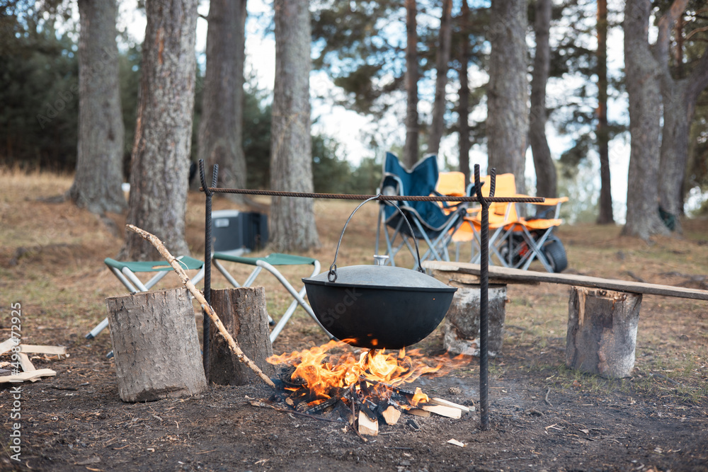 Cooking in cauldron on open fire in nature. Bowler on bonfire in forest. Pot from cast iron on campfire on background of river. Copy space.