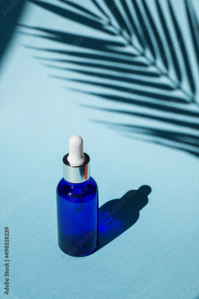 Bottle with dropper pipette with serum or essential oil. Blue background with daylight and beautiful palm shadows. Skincare products, natural cosmetic. Beauty concept for face and body care