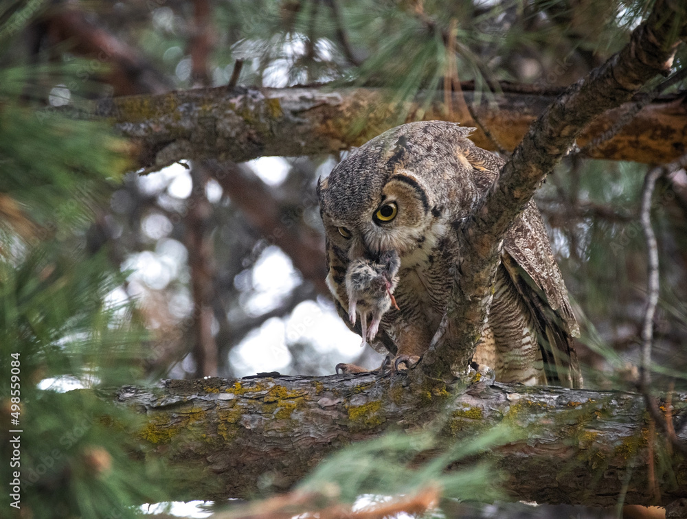 great horned owl with a rodent