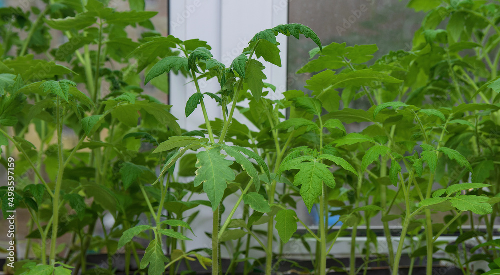 New seedlings of tomatoes grow on the windowsill for planting in the garden