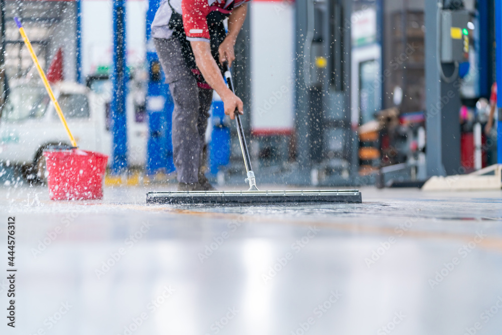 Gray professional disc machine on light beige carpet background. Closeup. Foaming and brushing equipment. Commercial cleaning service. Top down view. Wide banner. Empty place for text.