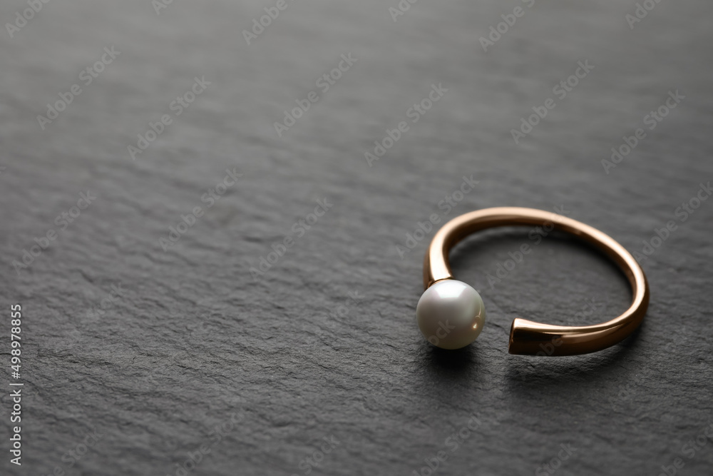 Elegant golden ring with pearl on black table. Space for text