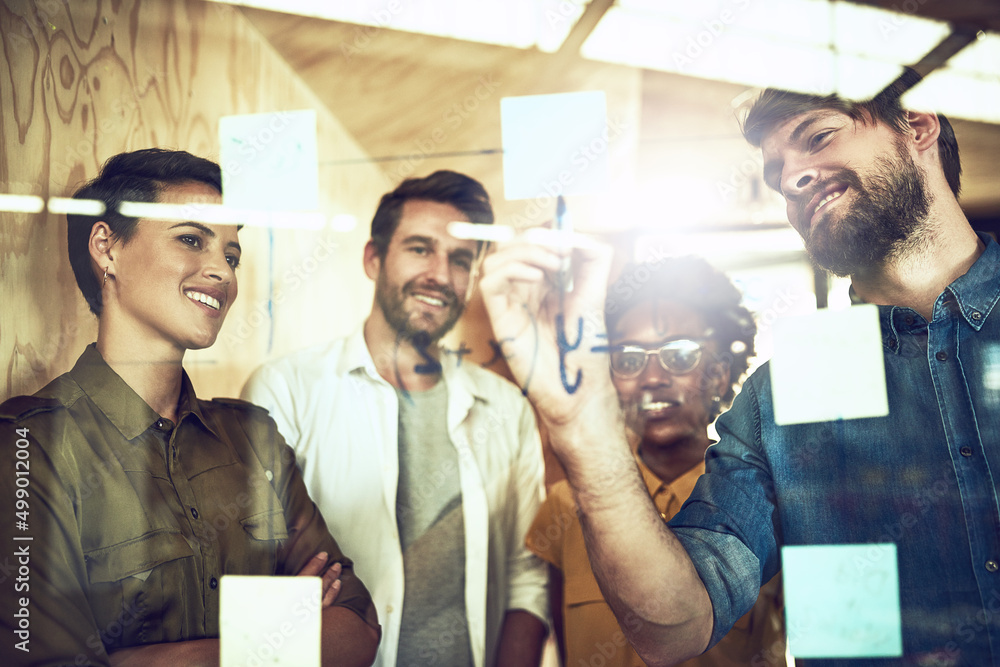 Theres no problem too hard for them to solve. Shot of a group of businesspeople brainstorming with notes on a glass wall.