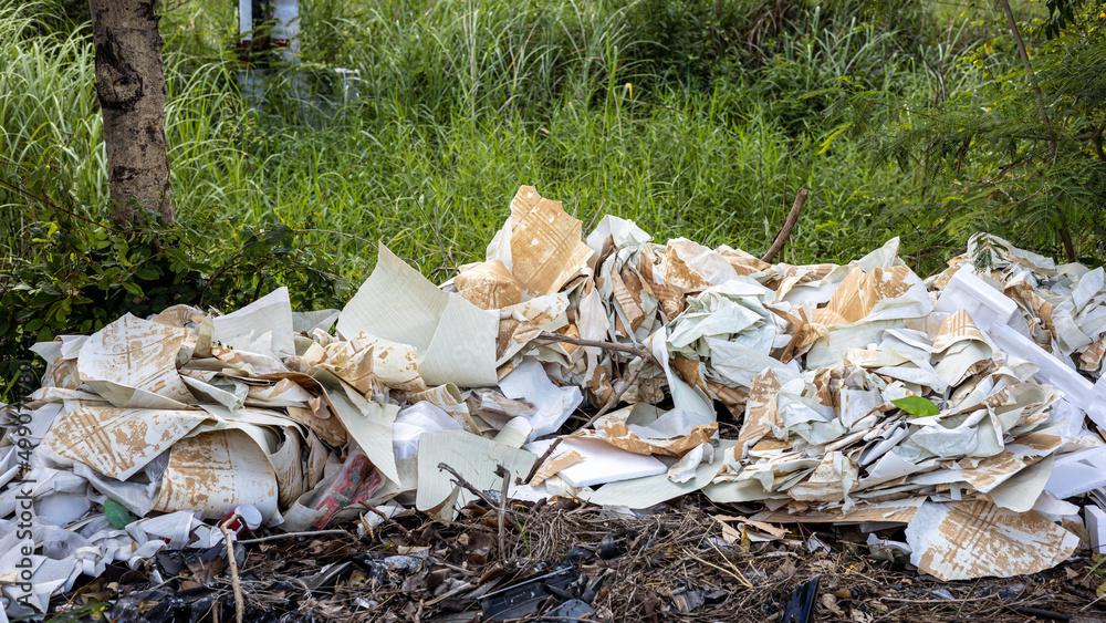 Many large, old, white and brown papers are crushed, flattened, smashed and piled up.